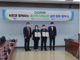 “한국순환자원유통지원센터”(이사장 김상훈, 이하 ‘유통지원센터’)와 “화성시(시장 정명근), CJ프레시웨이(대표이사 정성필), 화성시어린이집연합회(회장 김미아, 이하 ‘어린이집연합회’)”은 종이팩의 분리배출 인식 확산 및 회수 활성화를 위해 “다다익팩! 시민과 함께하는 종이팩 자원순환 실천 업무협약”을 10월 26일 화성시청에서 체결하였다.