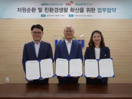 한국환경산업기술원(원장 최흥진)은 13일 서울 은평구 한국환경산업기술원 대회의실에서 첨단소재 기업 에스케이씨㈜(SKC, 대표이사 박원철), 새싹기업 ㈜몬테넘(공동대표 김수진, 강백주)과 게임앱을 활용한 자원순환 및 친환경 생활 확산을 위해 업무 협약을 체결했다.