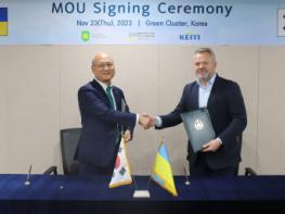 최흥진 한국환경산업기술원장(사진 왼쪽)은 11월 23일 오후 창업·벤처 녹색융합클러스터(인천시 서구 소재)에서 아나톨리 페도루크(Anatolii Fedoruk) 우크라이나 부차시장과 우크라이나의 전후 재건 협력에 대한 양해각서를 체결했다.