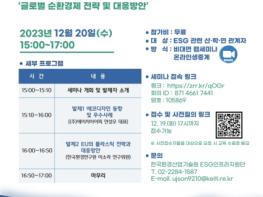 한국환경산업기술원(원장 최흥진)은 12월 20일 오후 3시 국제사회의 순환경제 전략 및 대응방안을 주제로 제9회 ‘ESG ON 세미나’를 개최한다.