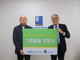 최흥진 한국환경산업기술원장(사진 왼쪽)은 12월 18일 오후 서울 도봉구에 위치한 굿윌스토어 밀알도봉점을 방문해 한상욱 밀알복지재단 굿윌본부장에게 임직원이 모은 재사용 가능 물품 2천여 점을 기증했다.