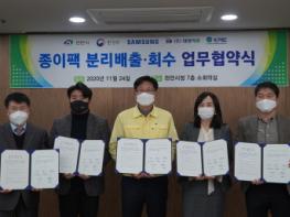 환경부(장관 조명래)는 2020년 11월 24일 천안시청에서 삼성전자(주), 천안시, 대성자원, (사)한국포장재재활용사업공제조합과 종이팩 별도 분리배출․회수를 위한 업무협약을 체결하였다.
