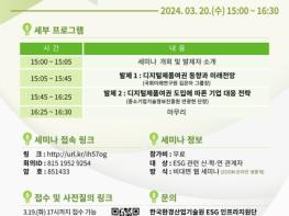 한국환경산업기술원(원장 최흥진)은 3월 20일 오후 ‘제12회 이에스지(ESG) 온(ON) 세미나’를 온라인상에서 열고 디지털 제품 여권 제도의 도입 동향과 기업의 대응 전략을 주제로 의견을 나눈다.