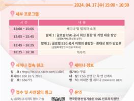한국환경산업기술원(원장 최흥진)은 환경·사회·투명경영(ESG) 공시의 최신 동향과 공시 이행의 출발점인 중대성 평가 방법론을 주제로 4월 17일 오후 ‘제13회 이에스지(ESG) 온(ON) 세미나’를 온라인으로 개최한다,