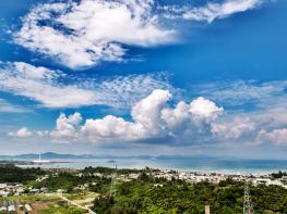 흡사 제주도와 비슷한 오키나와의 동쪽 해안의 모습이다. 나무들 사이로 일본 특유의 바다와 푸른 빛 하늘 사이로 흔히 뭉게구름이라 부르는 적운이 어우러져 장관을 이룬다.
