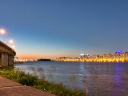 해질녘 촬영한 한강 야경이다. 일반적으로 서울의 대기는 미세먼지와 스모그로 인해 아름다운 하늘을 보기 어려운 편이다. 가을철이 되면 차가운 북동풍이 불어오면서 뜨겁게 달궈졌던 대지의 따뜻한 공기와 만나 강력한 대류현상이 발생해 먼지를 날려 보내게 되어 맑은 날씨를 보게 된다.
