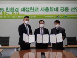 (사)한국포장재재활용사업공제조합(이사장 송재용)은 1월 19일 홈플러스 본점(강서점)에서 환경부 홍정기 차관, 홈플러스(주) 김웅 전무와 함께 “2025 친환경 재생원료 사용확대 공동 선언”을 하였다.
