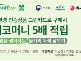 한국환경산업기술원은 BC카드, 올가홀푸드와 함께 5월 한 달 간 녹색소비 활성화를 위한 그린카드 특별 행사를 개최합니다.