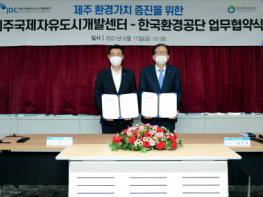 환경부 산하 한국환경공단(이사장 장준영)은 11일 제주국제자유도시개발센터(이하 JDC)에서 국토부 산하 JDC(이사장 문대림)와 제주도의 환경현안 해결과 지속가능한 개발을 위한 환경분야 포괄업무협약을 체결했다.