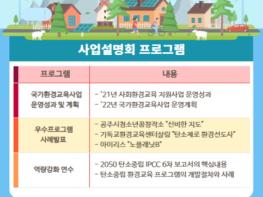 행사는 당일 13시에 시작되어 ▲‘21년 사회환경교육 지원사업 운영성과 ▲‘22년 국가환경교육사업 운영계획 ▲우수프로그램 운영사례 발표 ▲탄소중립프로그램 개발의 절차와 사례(시드콥 박재용 이사) ▲IPCC 6차보고서의 핵심내용(부산대학교 이준이 교수) 순으로 진행되며, 참자가를 대상으로 탄소중립 환경교육 교구가 제공된다.