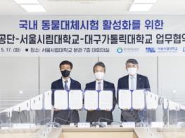 한국환경공단(안병옥 이사장)은 서울시립대학교(서순탁 총장), 대구가톨릭대학교(우동기 총장)와 함께 국내 동물대체시험 활성화를 위해 5월 17일 다자간 업무협약(MOU)을 체결했다.