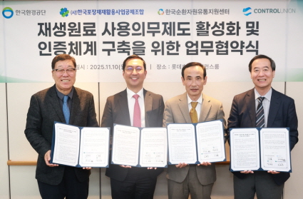 (사)한국포장재재활용사업공제조합(이사장 김동진, 이하 ‘조합’)은 2025년 11월 10일, 한국환경공단(임상준 이사장 이하 ‘공단’), 한국순환자원유통지원센터(이사장 이명환, 이하 ‘센터’), ㈜컨트롤유니온코리아(대표 계성경, 이하 ‘컨유’)와「재생원료 사용의무제도 활성화 및 인증체계 구축을 위한 업무협약」을 체결했다.