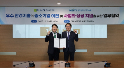 한국환경산업기술원은 12월 15일 오후 서울 여의도 기술보증기금 서울사무소에서 기술보증기금과 「우수 환경기술의 중소기업 이전 및 사업화 성공 지원을 위한 업무협약」을 체결했다.
