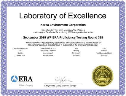 기후에너지환경부 산하 한국환경공단(이사장 임상준)은 미국 환경자원협회(ERA)가 주관하는 2025년도 국제숙련도시험(이하 ‘숙련도시험’)에서 14년 연속 ‘최우수 분석기관(Laboratory of Excellence)’으로 선정됐다고 19일 밝혔다.