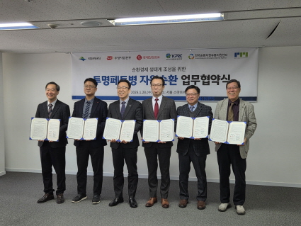 한국순환자원유통지원센터(이사장 이명환)는 1월 28일 국립공원 스마트워크센터(서울 중구)에서 국립공원공단(이사장 주대영), 우정사업본부(본부장 직무대리 곽병진), 롯데칠성음료㈜(대표이사 박윤기), (사)한국포장재재활용사업공제조합(이사장 김동진), ㈜알엠 화성공장(대표이사 송재권)과 함께 「투명페트병 자원순환 생태계 조성을 위한 업무협약」을 체결했다.