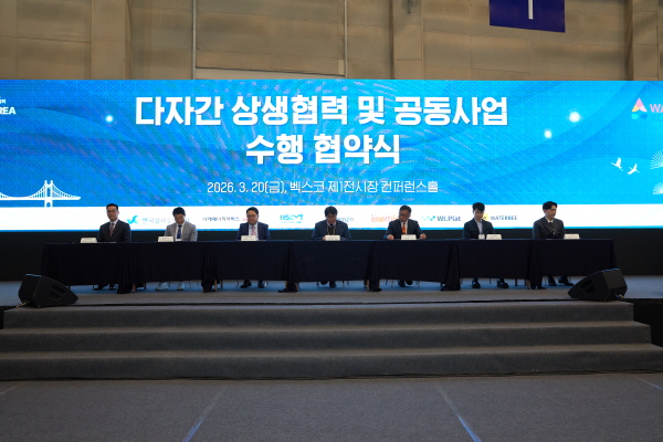 한국상하수도협회(협회장 유정복 인천광역시장, 이하 ‘협회’)는 3월 20일 ‘WATER KOREA 2026’ 행사장서 협회와 물기업 6개사(HSCMT, 나래에너지서비스(SK E&S), 삼진E&I, 에너토크, 위플랫, 워터비)가 함께 글로벌 시장 진출을 위한 다자간 상생협력 공동사업 수행 업무협약을 체결하였다.