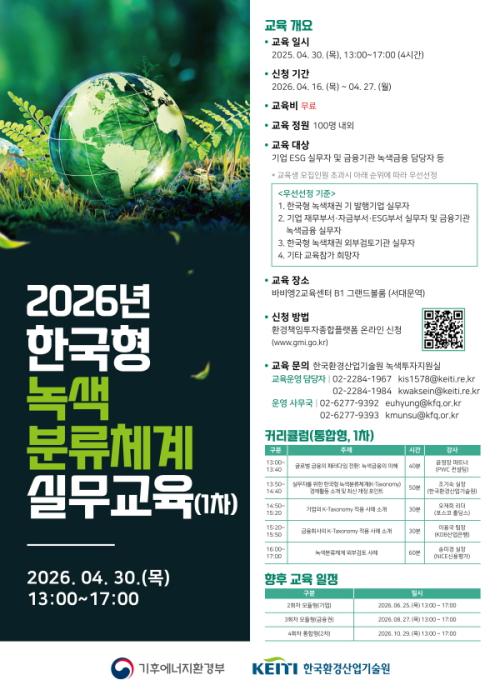 한국환경산업기술원은 녹색금융 활성화와 한국형 녹색분류체계(K-Taxonomy)의 적용 확산을 위해 4회에 걸쳐 ‘2026년 한국형 녹색분류체계 실무 교육’ 프로그램을 운영하며, 4월 16일부터 1회차 교육에 대해 신청을 받는다.