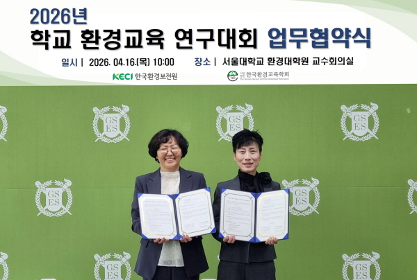 한국환경보전원(원장 신진수)은 (사)한국환경교육학회(회장 윤순진)와 4월 16일 서울대학교 환경대학원에서 ‘2026년 학교 환경교육 연구대회’의 성공적인 개최를 위한 업무협약을 체결했다고 밝혔다.